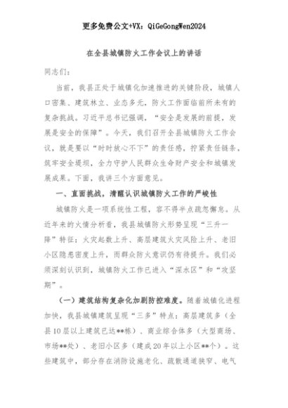 【七哥公文】2025年:在全县城镇防火工作会议上的讲话+更多免费公文+VX:QiGeGongWen2024+更多免费公文+VX:QiGeGongWen2024