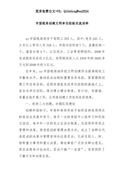 【七哥公文】2025年:市国税局创建文明单位经验交流材料+更多免费公文+VX:QiGeGongWen2024+更多免费公文+VX:QiGeGongWen2024