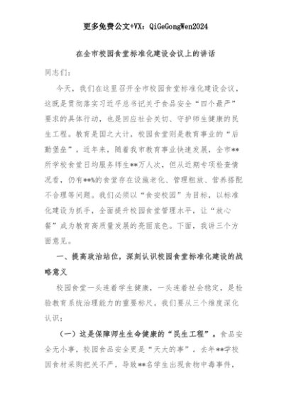 【七哥公文】2025年:在全市校园食堂标准化建设会议上的讲话+更多免费公文+VX:QiGeGongWen2024+更多免费公文+VX:QiGeGongWen2024