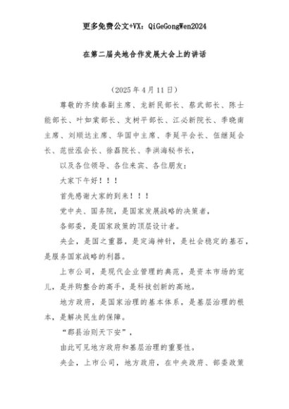 【七哥公文】2025年:在第二届央地合作发展大会上的讲话+更多免费公文+VX:QiGeGongWen2024+更多免费公文+VX:QiGeGongWen2024