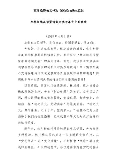 【七哥公文】2025年:在林川桃花节暨诗词大赛开幕式上的致辞+更多免费公文+VX:QiGeGongWen2024+更多免费公文+VX:QiGeGongWen2024
