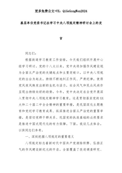 【七哥公文】2025年:基层单位党委书记在学习中央八项规定精神研讨会上的发言+更多免费公文+VX:QiGeGongWen2024+更多免费公文+VX:QiGeGongWen2024