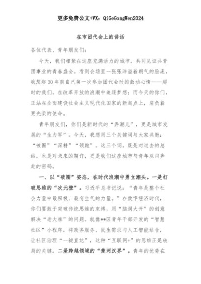 【七哥公文】2025年:在市团代会上的讲话+更多免费公文+VX:QiGeGongWen2024+更多免费公文+VX:QiGeGongWen2024