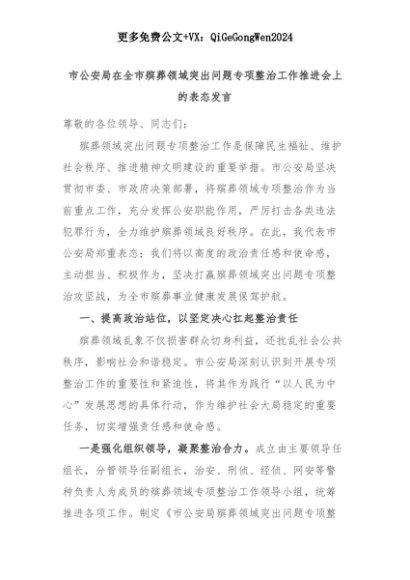 【七哥公文】2025年:市公安局在全市殡葬领域突出问题专项整治工作推进会上的表态发言+更多免费公文+VX:QiGeGongWen2024+更多免费公文+VX:QiGeGongWen2024