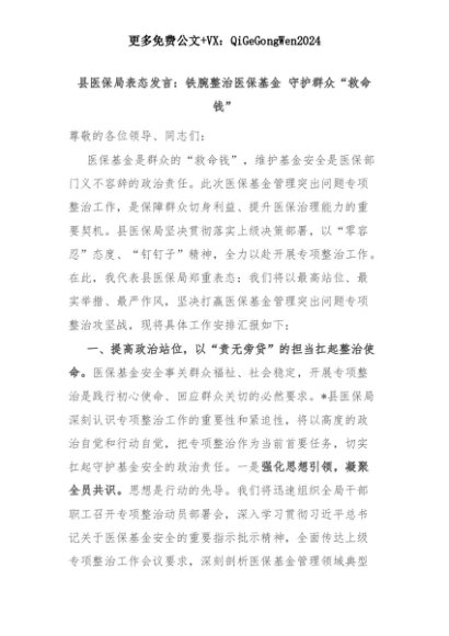 【七哥公文】2025年:县医保局表态发言:铁腕整治医保基金 守护群众“救命钱”+更多免费公文+VX:QiGeGongWen2024+更多免费公文+VX:QiGeGongWen2024