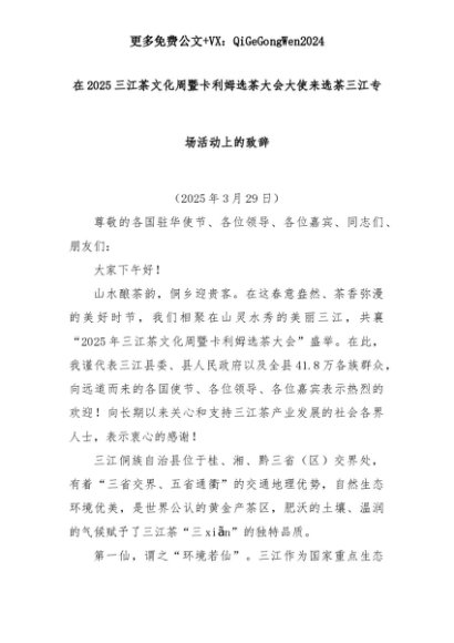 【七哥公文】2025年:在2025三江茶文化周暨卡利姆选茶大会大使来选茶三江专场活动上的致辞+更多免费公文+VX:QiGeGongWen2024+更多免费公文+VX:QiGeGongWen2024