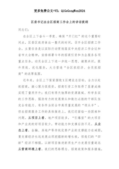 【七哥公文】2025年:区委书记在全区招商工作会上的讲话提纲+更多免费公文+VX:QiGeGongWen2024+更多免费公文+VX:QiGeGongWen2024