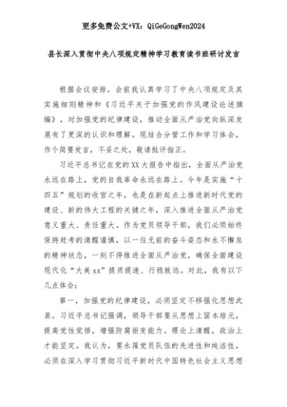 【七哥公文】2025年:县长深入贯彻中央八项规定精神学习教育读书班研讨发言+更多免费公文+VX:QiGeGongWen2024+更多免费公文+VX:QiGeGongWen2024