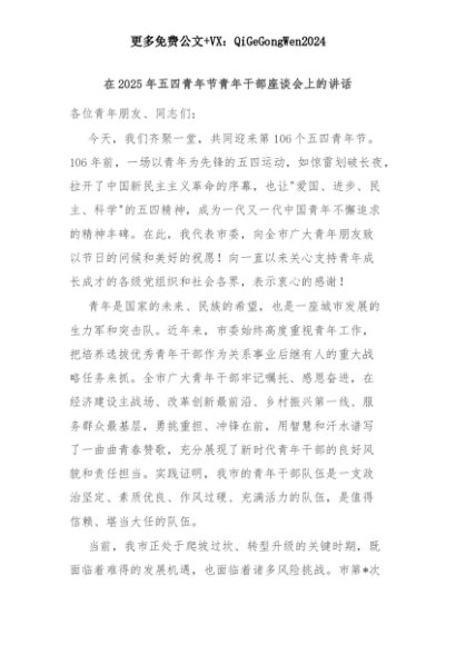 【七哥公文】2025年:在2025年五四青年节青年干部座谈会上的讲话+更多免费公文+VX:QiGeGongWen2024+更多免费公文+VX:QiGeGongWen2024