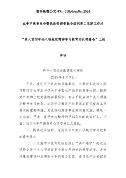 【七哥公文】2025年:在中华慈善总会暨民政部部管社会组织第二党建工作站“深入贯彻中央八项规定精神学习教育动员部署会”上的讲话+更多免费公文+VX:QiGeGongWen2024+更多免费公文+VX:QiGeGongWen2024
