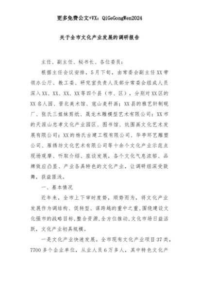 【七哥公文】2025年:关于全市文化产业发展的调研报告+更多免费公文+VX:QiGeGongWen2024+更多免费公文+VX:QiGeGongWen2024
