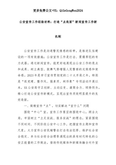 【七哥公文】2025年:公安宣传工作经验材料:打造“点线面”新闻宣传工作新机制+更多免费公文+VX:QiGeGongWen2024+更多免费公文+VX:QiGeGongWen2024