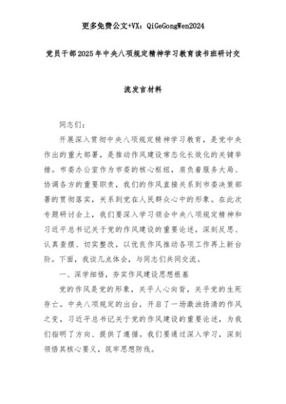 【七哥公文】2025年:党员干部2025年中央八项规定精神学习教育读书班研讨交流发言材料+更多免费公文+VX:QiGeGongWen2024+更多免费公文+VX:QiGeGongWen2024
