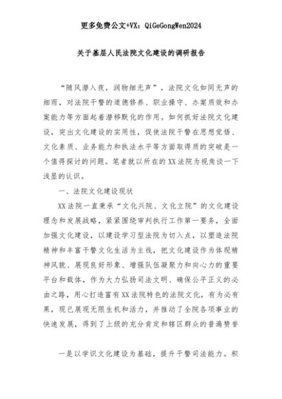 【七哥公文】2025年:关于基层人民法院文化建设的调研报告+更多免费公文+VX:QiGeGongWen2024+更多免费公文+VX:QiGeGongWen2024