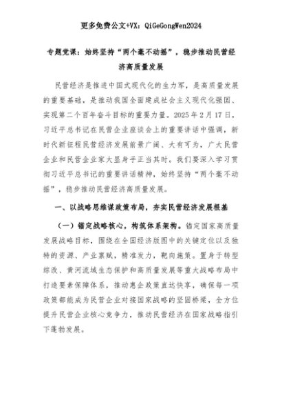 【七哥公文】2025年:专题党课:始终坚持“两个毫不动摇”,稳步推动民营经济高质量发展+更多免费公文+VX:QiGeGongWen2024+更多免费公文+VX:QiGeGongWen2024