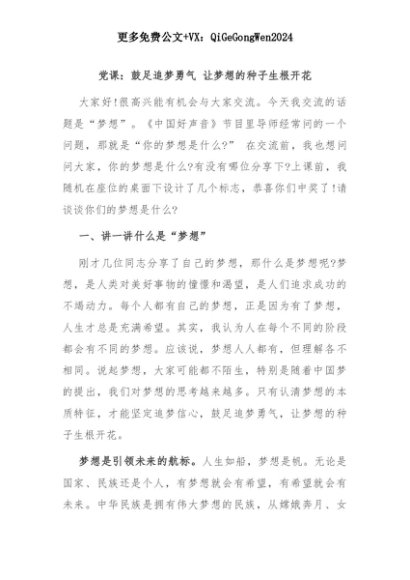 【七哥公文】2025年:党课:鼓足追梦勇气 让梦想的种子生根开花+更多免费公文+VX:QiGeGongWen2024+更多免费公文+VX:QiGeGongWen2024