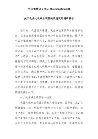 【七哥公文】2025年:关于我县文化事业项目建设情况的调研报告+更多免费公文+VX:QiGeGongWen2024+更多免费公文+VX:QiGeGongWen2024