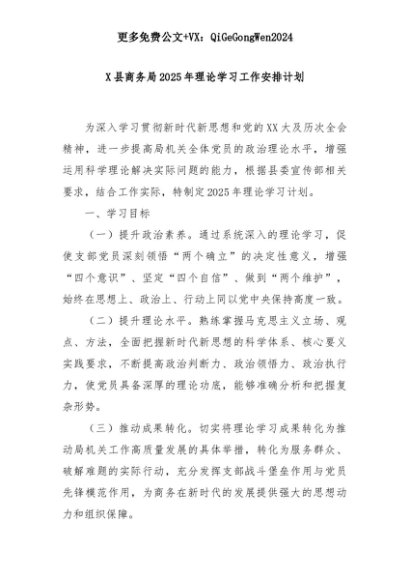 【七哥公文】2025年:X县商务局2025年理论学习工作安排计划+更多免费公文+VX:QiGeGongWen2024+更多免费公文+VX:QiGeGongWen2024
