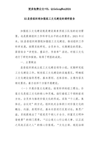 【七哥公文】2025年:XX县委组织部加强组工文化建设的调研报告+更多免费公文+VX:QiGeGongWen2024+更多免费公文+VX:QiGeGongWen2024