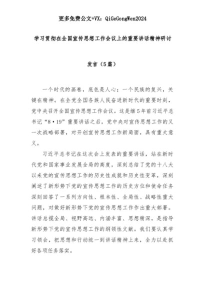 【七哥公文】2025年:(5篇)学习贯彻在全国宣传思想工作会议上的重要讲话精神研讨发言+更多免费公文+VX:QiGeGongWen2024+更多免费公文+VX:QiGeGongWen2024