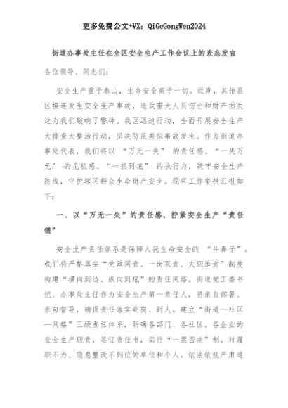 【七哥公文】2025年:街道办事处主任在全区安全生产工作会议上的表态发言+更多免费公文+VX:QiGeGongWen2024+更多免费公文+VX:QiGeGongWen2024