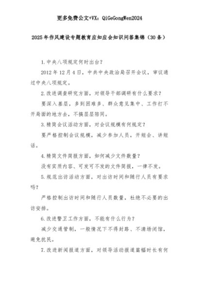 【七哥公文】2025年:2025年作风建设专题教育应知应会知识问答集锦(30条)+更多免费公文+VX:QiGeGongWen2024+更多免费公文+VX:QiGeGongWen2024