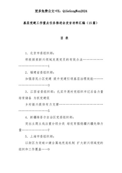【七哥公文】2025年:(15篇)基层党建工作重点任务推进会发言材料汇编+更多免费公文+VX:QiGeGongWen2024+更多免费公文+VX:QiGeGongWen2024
