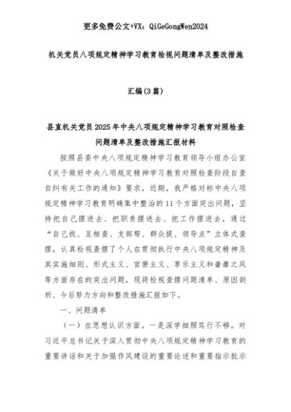 【七哥公文】2025年:(3篇)机关党员八项规定精神学习教育检视问题清单及整改措施汇编+更多免费公文+VX:QiGeGongWen2024+更多免费公文+VX:QiGeGongWen2024