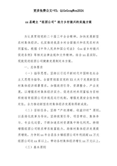 【七哥公文】2025年:xx县建立“组团公司”助力乡村振兴的实施方案+更多免费公文+VX:QiGeGongWen2024+更多免费公文+VX:QiGeGongWen2024