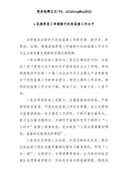 【七哥公文】2025年:x县烟草局三举措提升纪检监察工作水平+更多免费公文+VX:QiGeGongWen2024+更多免费公文+VX:QiGeGongWen2024