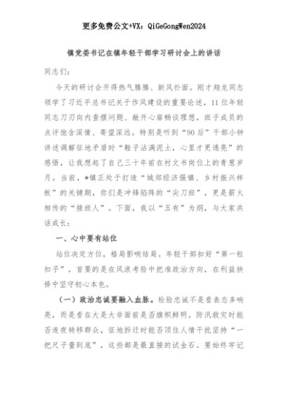 【七哥公文】2025年:镇党委书记在镇年轻干部学习研讨会上的讲话+更多免费公文+VX:QiGeGongWen2024+更多免费公文+VX:QiGeGongWen2024