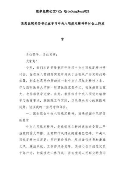 【七哥公文】2025年:某某医院党委书记在学习中央八项规定精神研讨会上的发言+更多免费公文+VX:QiGeGongWen2024+更多免费公文+VX:QiGeGongWen2024