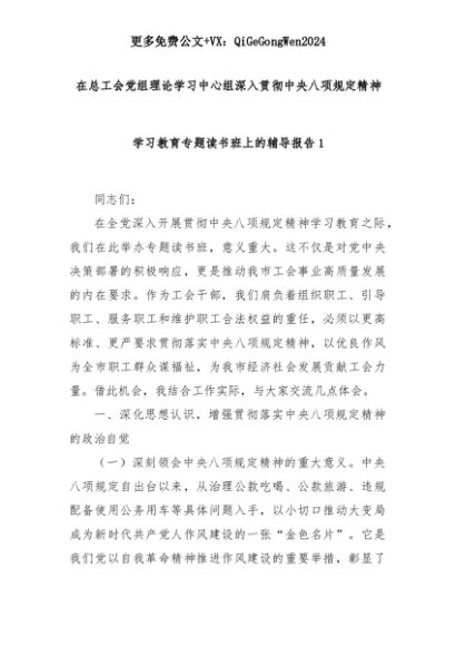 【七哥公文】2025年:在总工会党组理论学习中心组深入贯彻中央八项规定精神学习教育专题读书班上的辅导报告1+更多免费公文+VX:QiGeGongWen2024+更多免费公文+VX:QiGeGongWen2024
