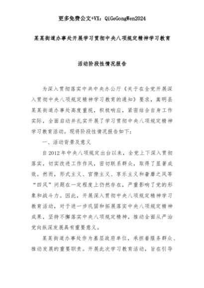 【七哥公文】2025年:某某街道办事处开展学习贯彻中央八项规定精神学习教育活动阶段性情况报告+更多免费公文+VX:QiGeGongWen2024+更多免费公文+VX:QiGeGongWen2024