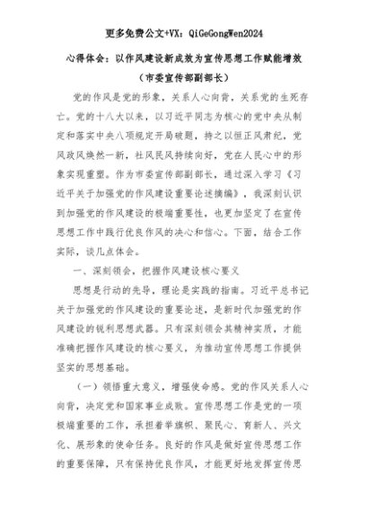 【七哥公文】2025年:心得体会:以作风建设新成效为宣传思想工作赋能增效(市委宣传部副部长)+更多免费公文+VX:QiGeGongWen2024+更多免费公文+VX:QiGeGongWen2024