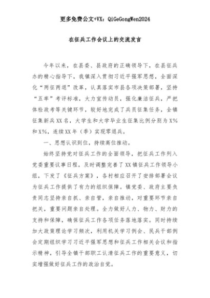 【七哥公文】2025年:在征兵工作会议上的交流发言+更多免费公文+VX:QiGeGongWen2024+更多免费公文+VX:QiGeGongWen2024