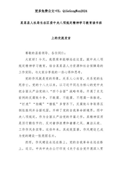 【七哥公文】2025年:某某县人社局长在区委中央八项规定精神学习教育读书班上的交流发言+更多免费公文+VX:QiGeGongWen2024+更多免费公文+VX:QiGeGongWen2024