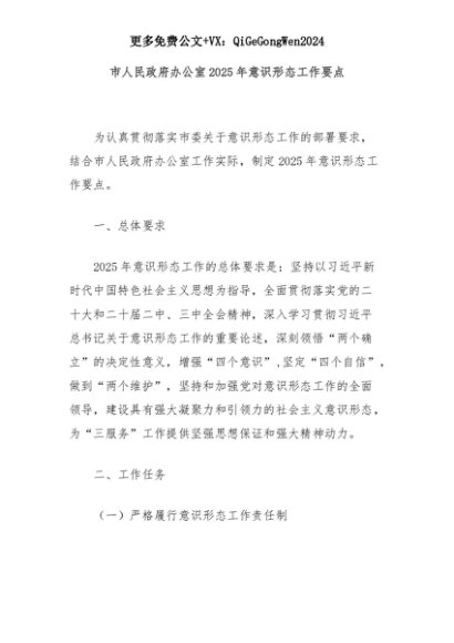 【七哥公文】2025年:市人民政府办公室2025年意识形态工作要点+更多免费公文+VX:QiGeGongWen2024+更多免费公文+VX:QiGeGongWen2024