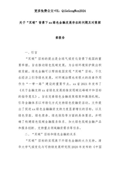 【七哥公文】2025年:关于“双碳”背景下xx绿色金融发展存在的问题及对策探索报告+更多免费公文+VX:QiGeGongWen2024+更多免费公文+VX:QiGeGongWen2024