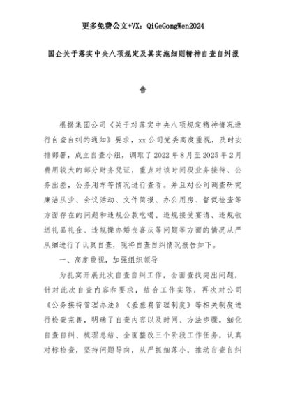 【七哥公文】2025年:国企关于落实中央八项规定及其实施细则精神自查自纠报告+更多免费公文+VX:QiGeGongWen2024+更多免费公文+VX:QiGeGongWen2024