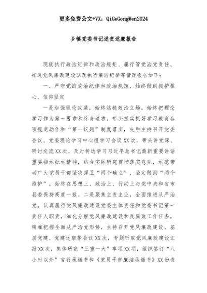 【七哥公文】2025年:乡镇党委书记述责述廉报告+更多免费公文+VX:QiGeGongWen2024+更多免费公文+VX:QiGeGongWen2024
