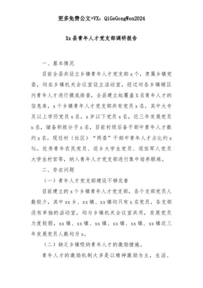 【七哥公文】2025年:Xx县青年人才党支部调研报告+更多免费公文+VX:QiGeGongWen2024+更多免费公文+VX:QiGeGongWen2024