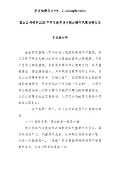 【七哥公文】2025年:国企公司领导2025年学习教育读书班加强作风建设研讨发言交流材料+更多免费公文+VX:QiGeGongWen2024+更多免费公文+VX:QiGeGongWen2024