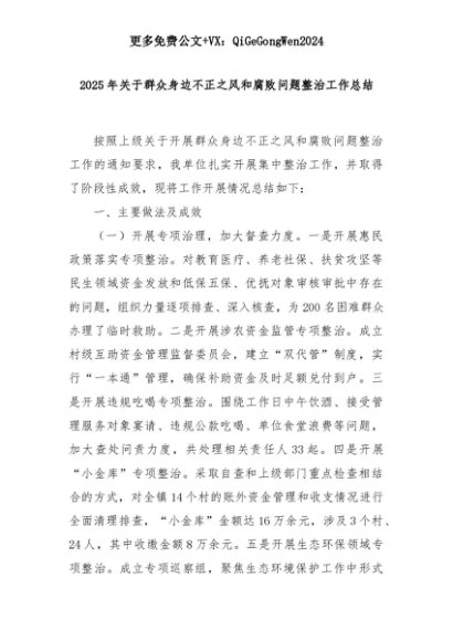 【七哥公文】2025年:2025年关于群众身边不正之风和腐败问题整治工作总结+更多免费公文+VX:QiGeGongWen2024+更多免费公文+VX:QiGeGongWen2024