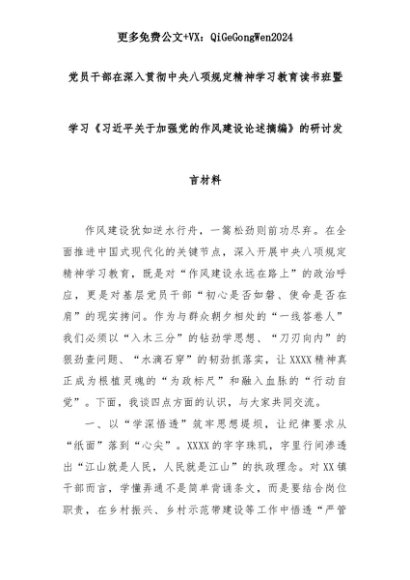 【七哥公文】2025年:党员干部在深入贯彻中央八项规定精神学习教育读书班暨学习《总书记关于加强党的作风建设论述摘编》的研讨发言材料+更多免费公文+VX:QiGeGongWen2024+更多免费公文+VX:QiGeGongWen2024