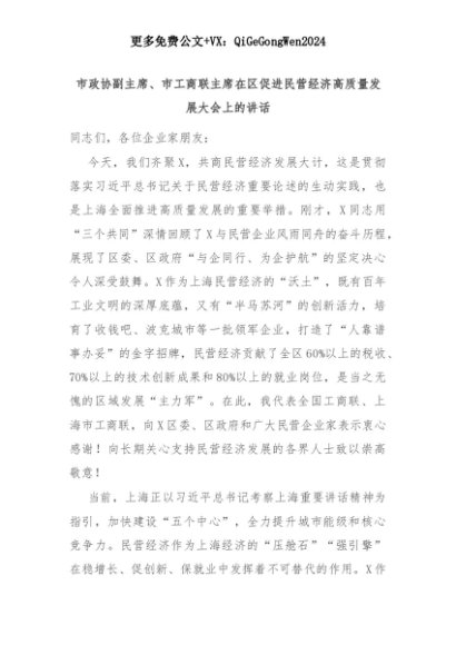 【七哥公文】2025年:市政协副主席、市工商联主席在区促进民营经济高质量发展大会上的讲话+更多免费公文+VX:QiGeGongWen2024+更多免费公文+VX:QiGeGongWen2024