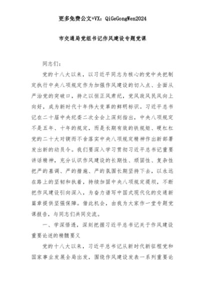 【七哥公文】2025年:市交通局党组书记作风建设专题党课+更多免费公文+VX:QiGeGongWen2024+更多免费公文+VX:QiGeGongWen2024