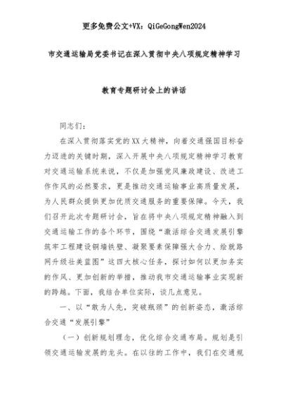 【七哥公文】2025年:市交通运输局党委书记在深入贯彻中央八项规定精神学习教育专题研讨会上的讲话+更多免费公文+VX:QiGeGongWen2024+更多免费公文+VX:QiGeGongWen2024