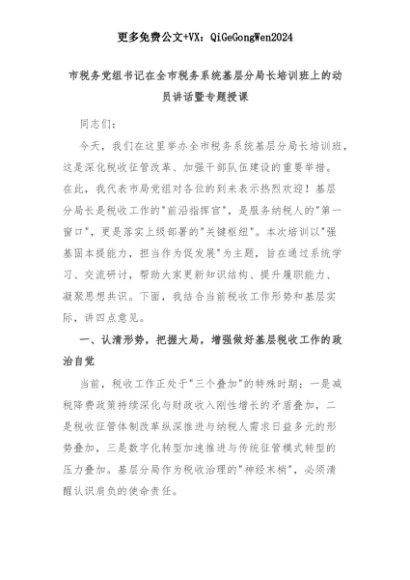 【七哥公文】2025年:市税务党组书记在全市税务系统基层分局长培训班上的动员讲话暨专题授课+更多免费公文+VX:QiGeGongWen2024+更多免费公文+VX:QiGeGongWen2024