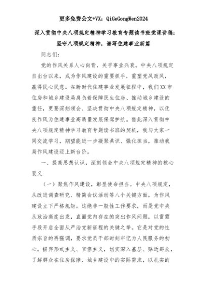 【七哥公文】2025年:深入贯彻中央八项规定精神学习教育专题读书班党课讲稿:坚守八项规定精神,谱写住建事业新篇+更多免费公文+VX:QiGeGongWen2024+更多免费公文+VX:QiGeGongWen2024